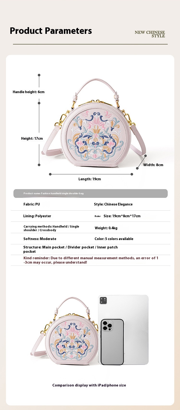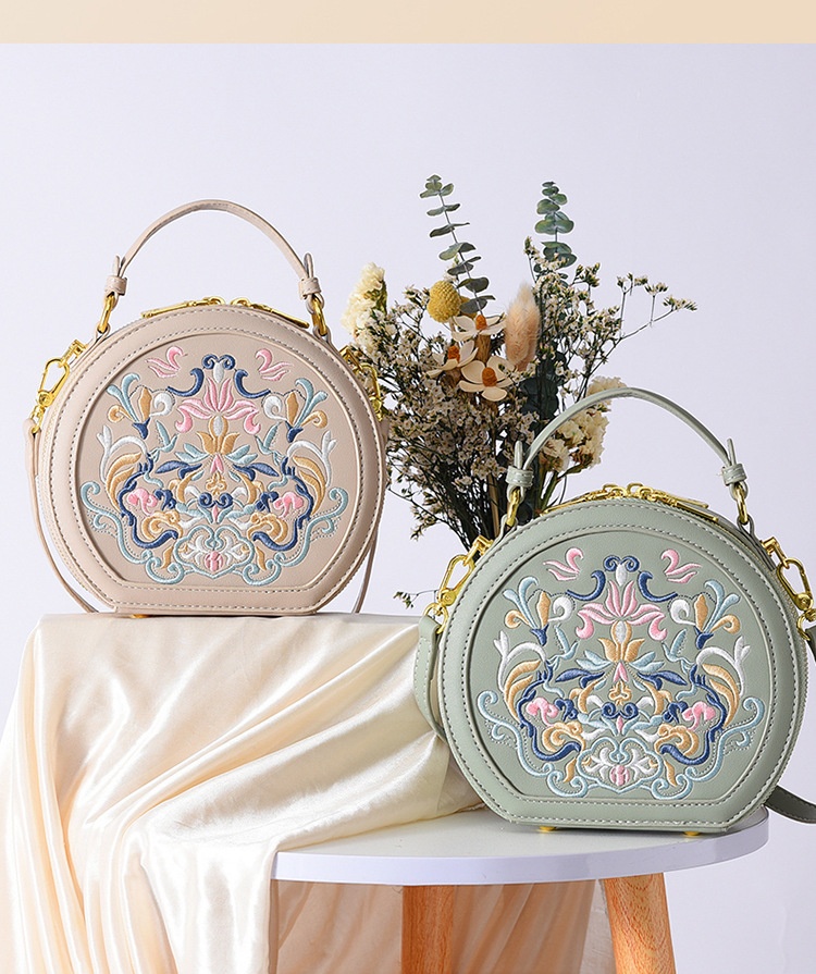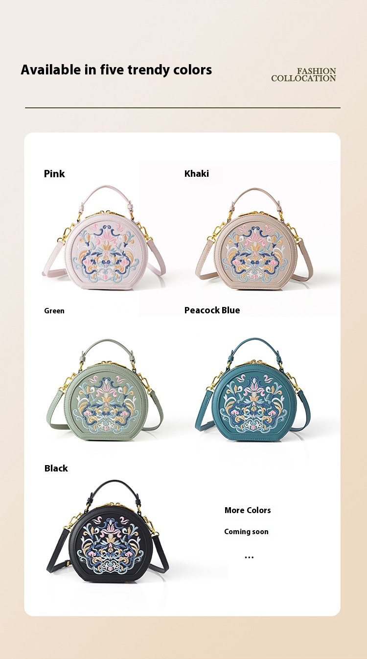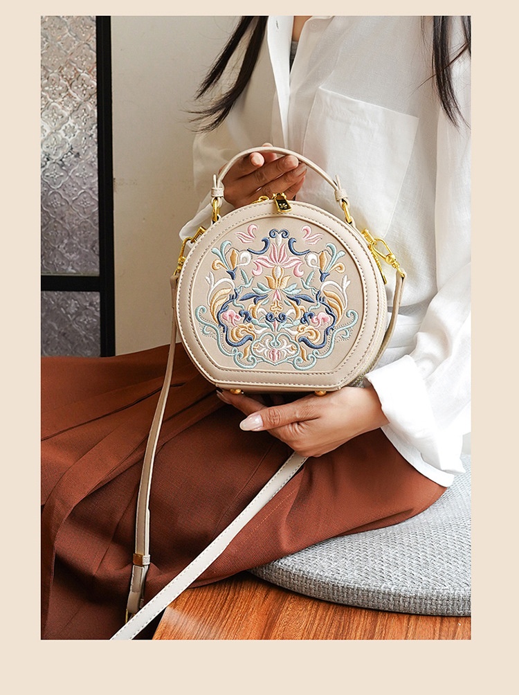 Made from premium PU leather, the bag has a medium-hard structure that holds its round shape beautifully. It feels smooth and sturdy while being lightweight enough for everyday wear. The embroidery detail adds a creative, handmade feel that reflects traditional national fashion with a fresh and stylish twist.